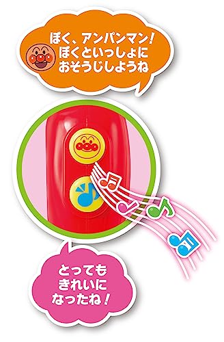●アンパンマンのおしゃべり7ワード、音符ボタンを押すと〈アンパンマンのマーチ・もりのくまさん ・おもちゃのマーチ〉のメロディ3曲が流れておそうじごっこを盛り上げます。